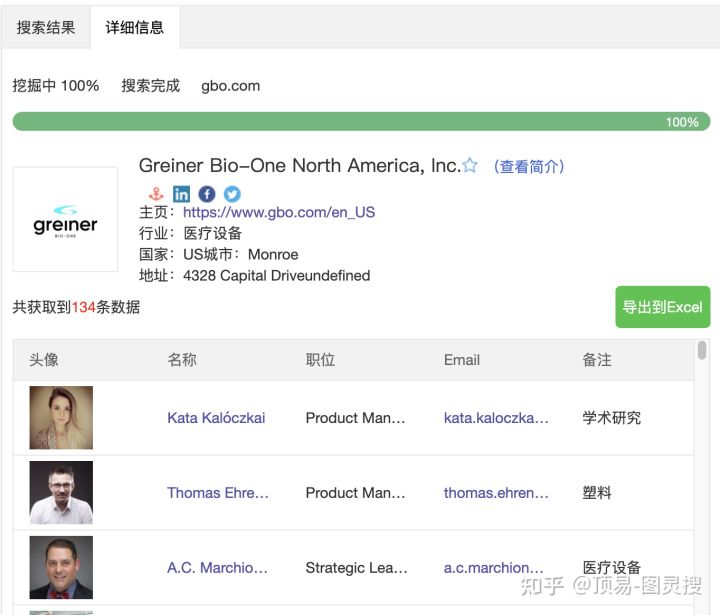 搜索结果出来,这家公司的决策人的头像、名称、职位、邮箱均已经显示出来,可以导出Excel。